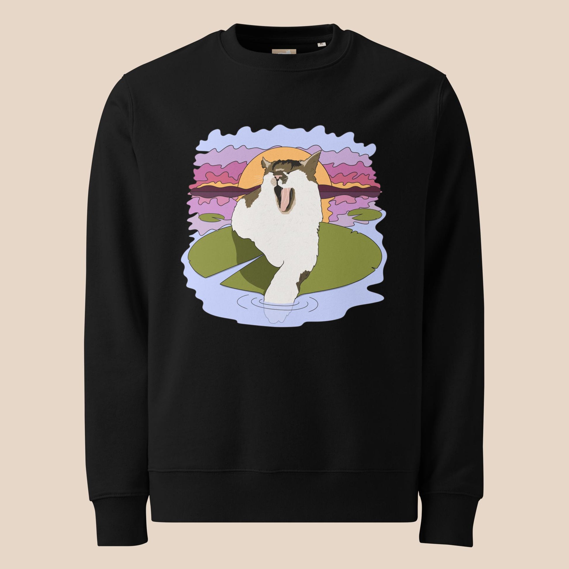 Designed for everyday comfort with a refined finish, the Finn’s Sunset Eco Sweatshirt is made from organic and recycled materials. Featuring a hand-drawn illustration of Finn peacefully yawning while sitting on a water lily at sunset, this sweatshirt captures a quiet moment of stillness — a gentle tribute to nature, calm, and the animals who bring us joy.